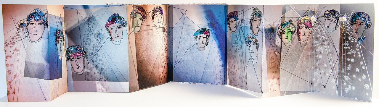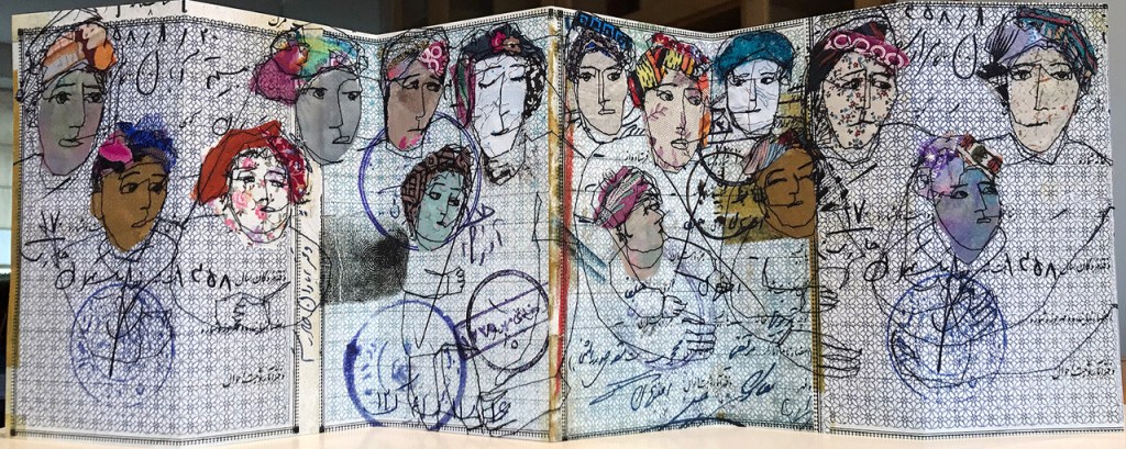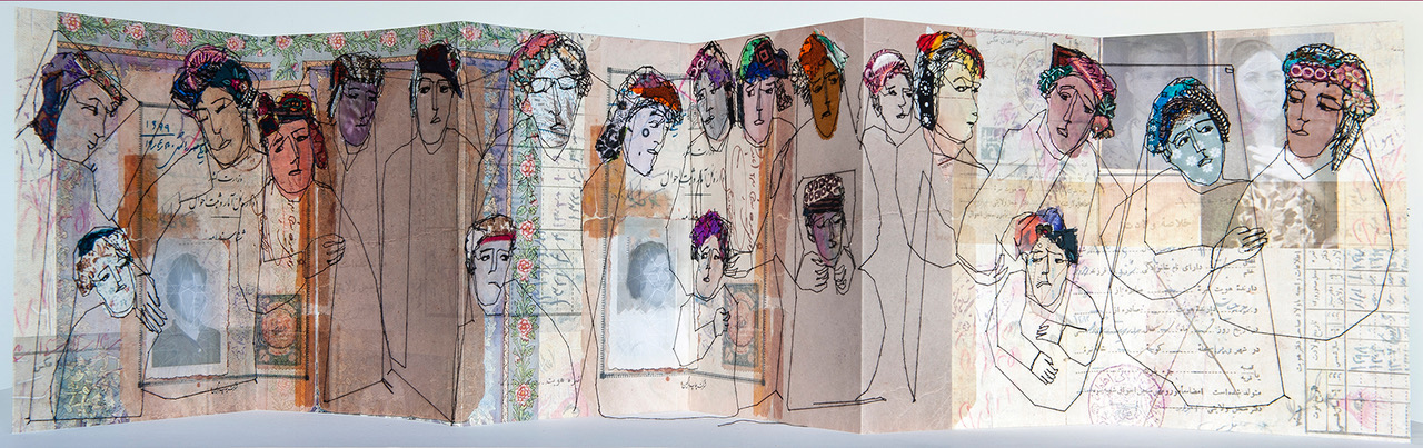 Batool Showghi’s multidisciplinary approach to the artists’ book and her mixed media work involve photography, illustration, painting and textiles. All of which are employed to explore themes of cultural heritage, memory, identity and loss in very personal ways. Her work as an artist is concerned with the experience of women and the way in which this experience relates to cultural and religious boundaries as well as reflecting on the theme of turbulence, immigration, disintegration of the family and the experience of displacement. In recent projects and artist’s books Batool uses textile pieces on canvas and paper and the use of a sewing machine as a drawing tool to create her imagery.