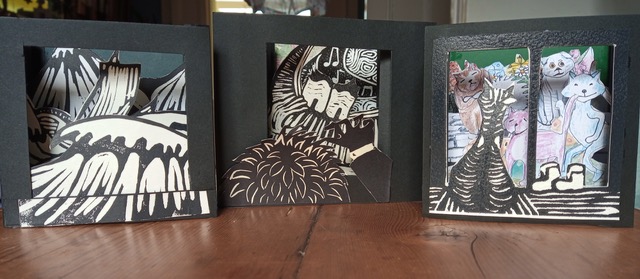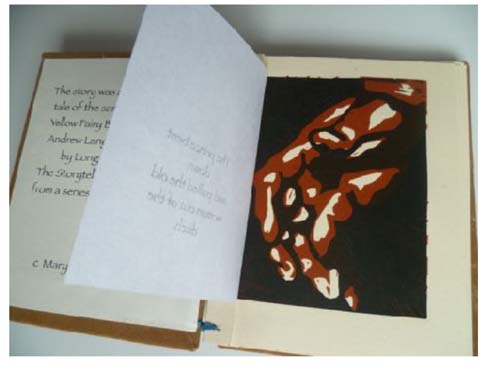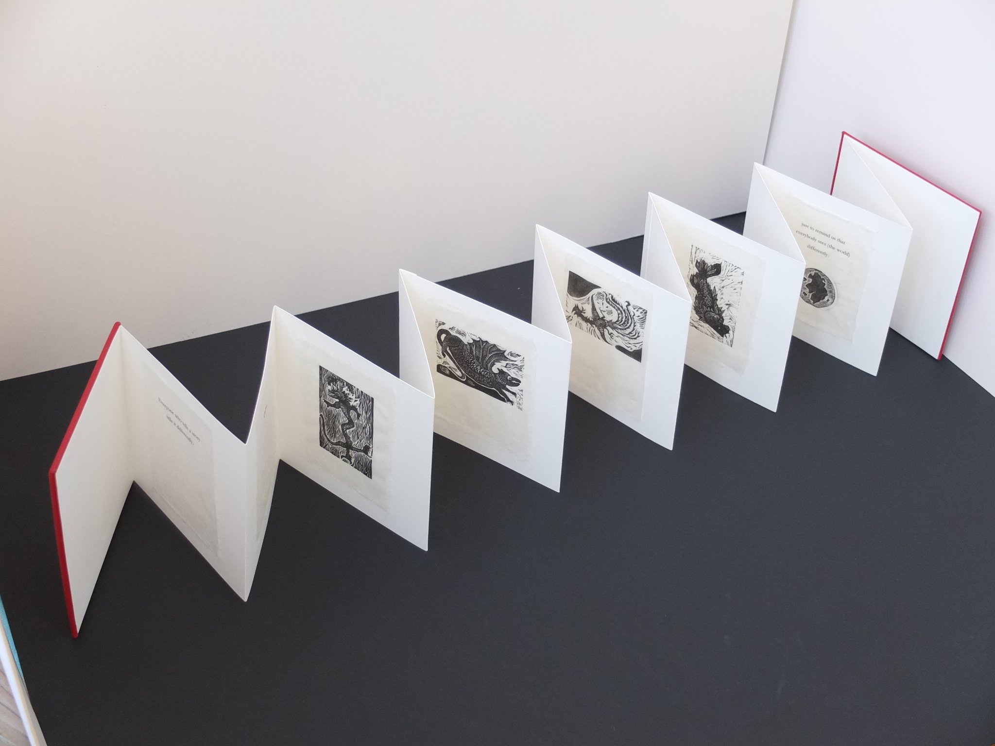Mary has worked all over the world entertaining and educating people to enjoy and make their own stories, their own books. The books she makes all have a story. Some are specially bound texts. Some have text and moving parts and some are purely visual. She makes them from her own relief prints, collage, ink drawings and watercolour. Her website and Instagram pages encourage readers to think “What’s the story?”