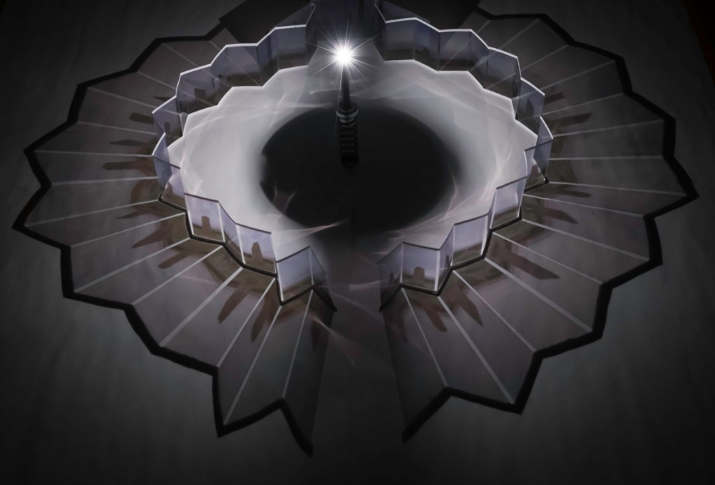 Originally Sixty. Malcolm Raggett. Printed film, Tyvek, candle and polypropylene. Double concertina book expanding to 1 metre diameter. Inspired by the Ring of Brodgar, Orkney.