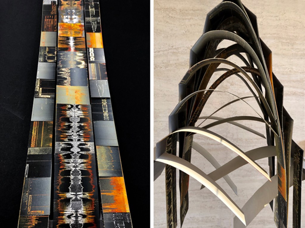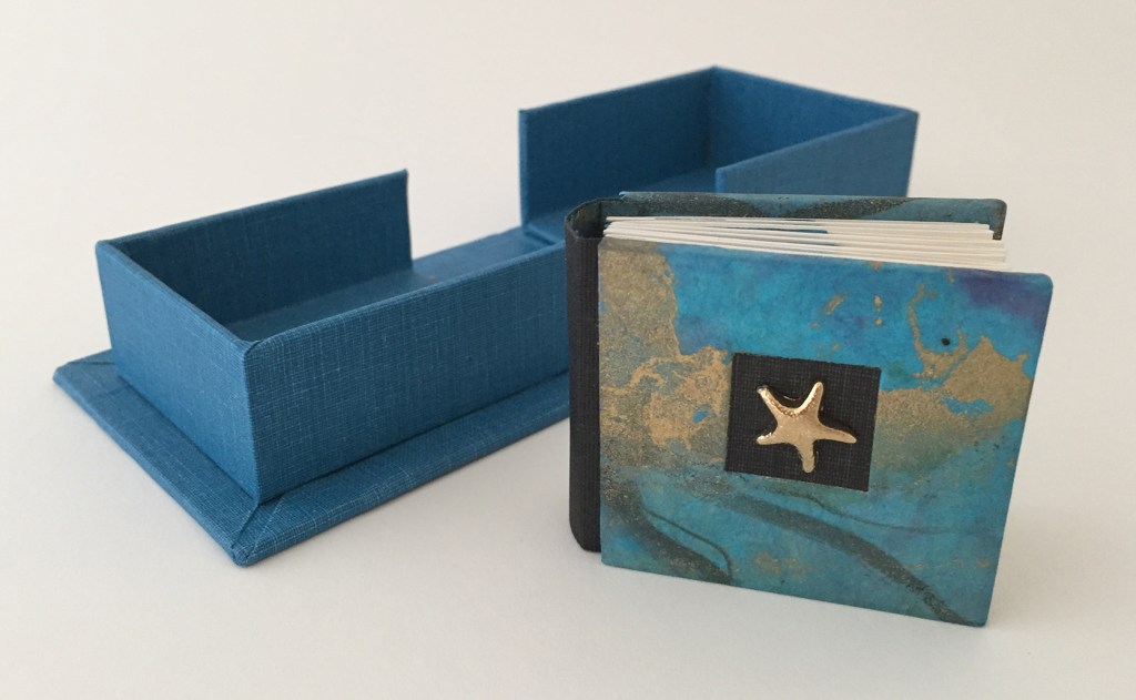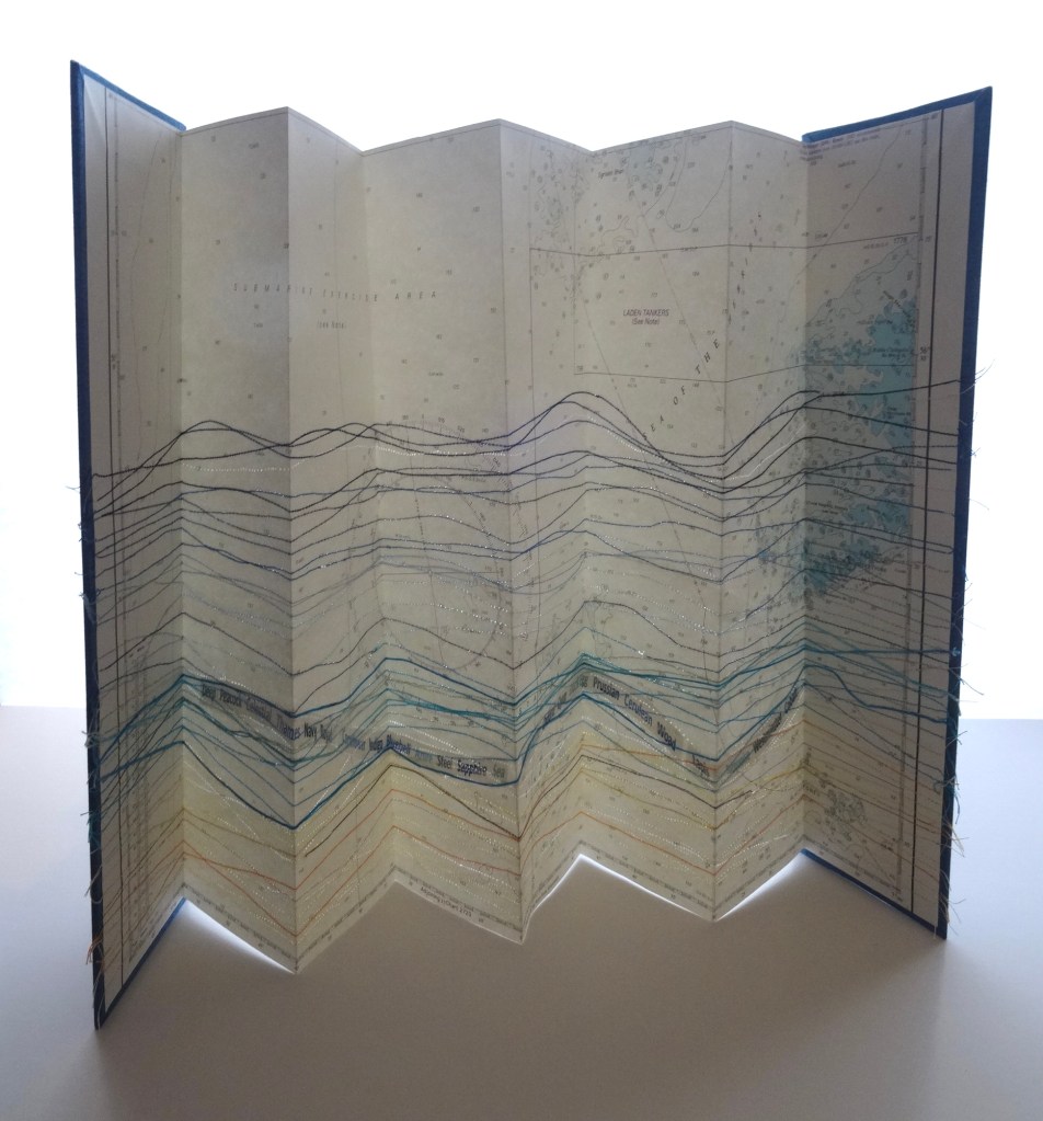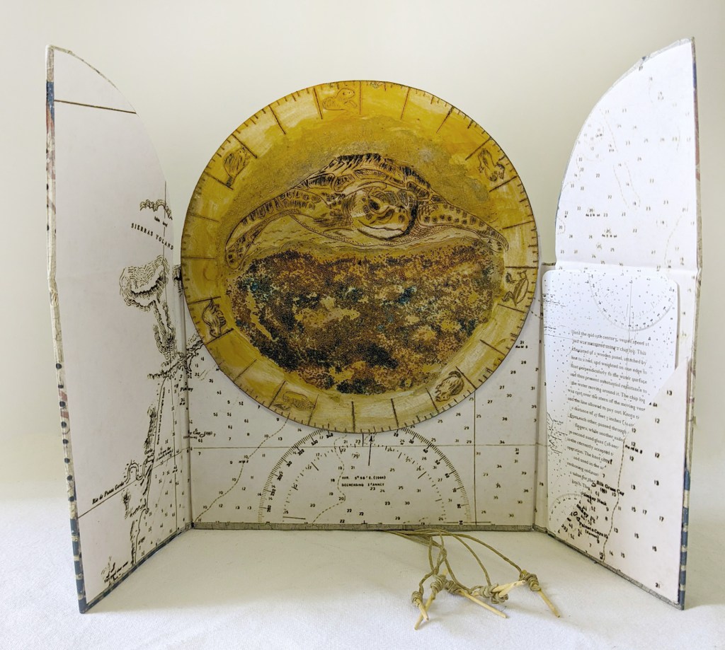 I make artist’s books that entertain and intrigue by combining printmaking (monoprints, collagraph, wood engraving, letterpress and digital prints) with upcycled materials (packaging, maps, nautical charts) and found objects. I enjoy introducing other techniques such as hand or machine stitching.