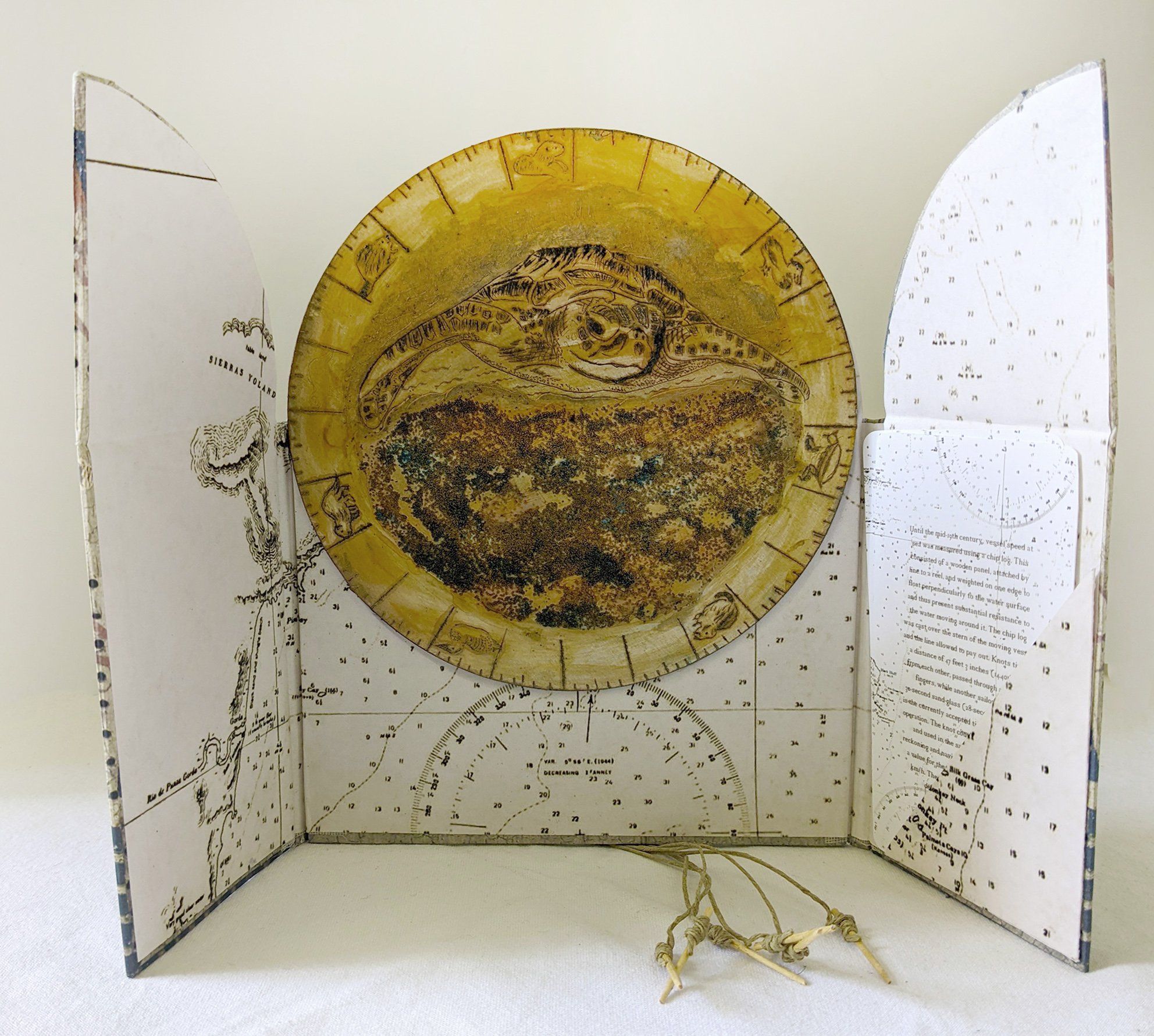 Chip Log: a book that describes how a wooden 'chip log' was used until quite recently to navigate the seas. It incorporates a collagraph plate that seemed to work with it.