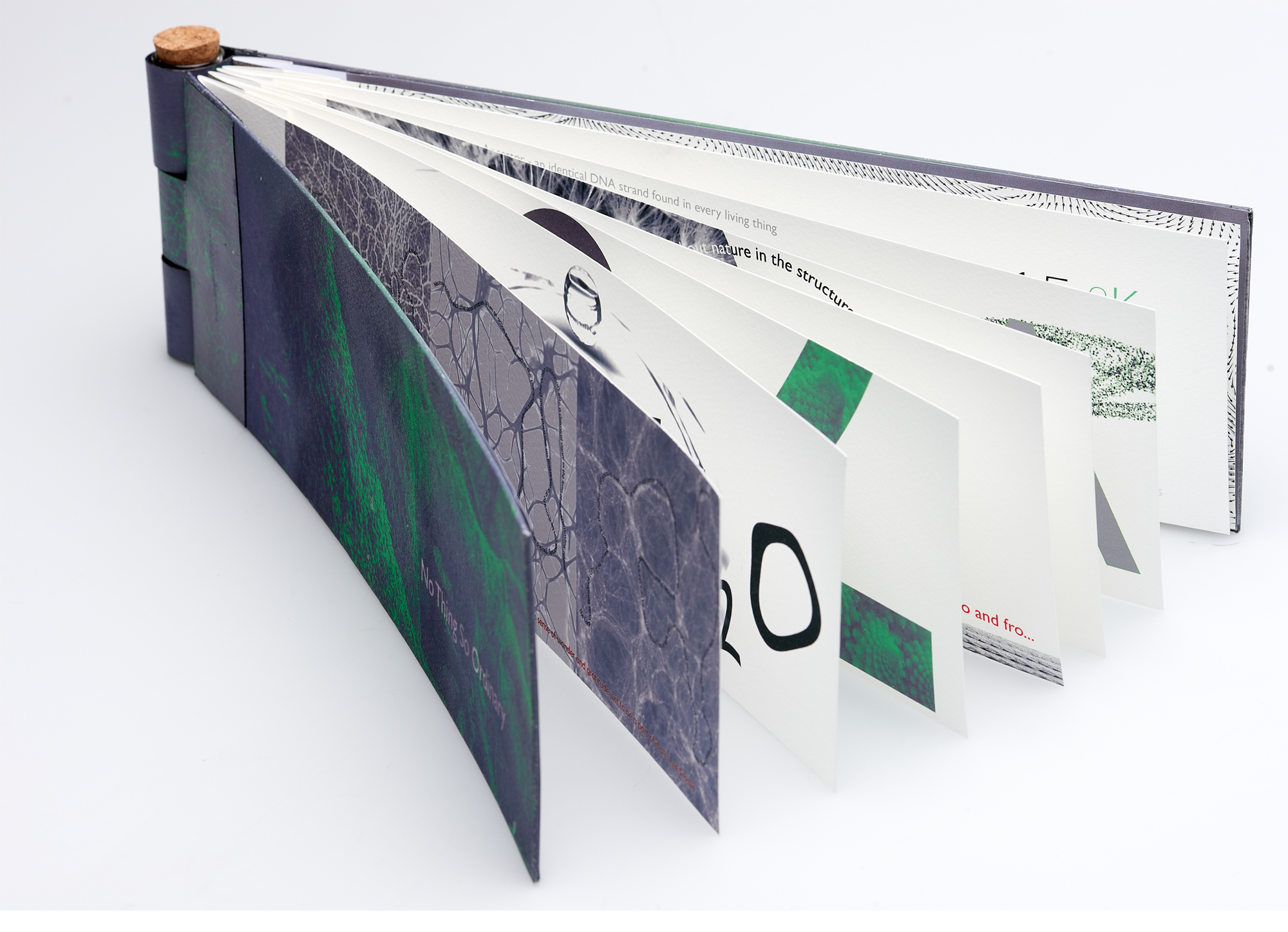 No Thing So Ordinary: a book inspired by a phrase from physicist, Lee Smolin, who described the wonder he feels when contemplating ordinary things from a scientific perspective. Piano binding using a test tube that contains ordinary things, and which reveals a hidden spine.